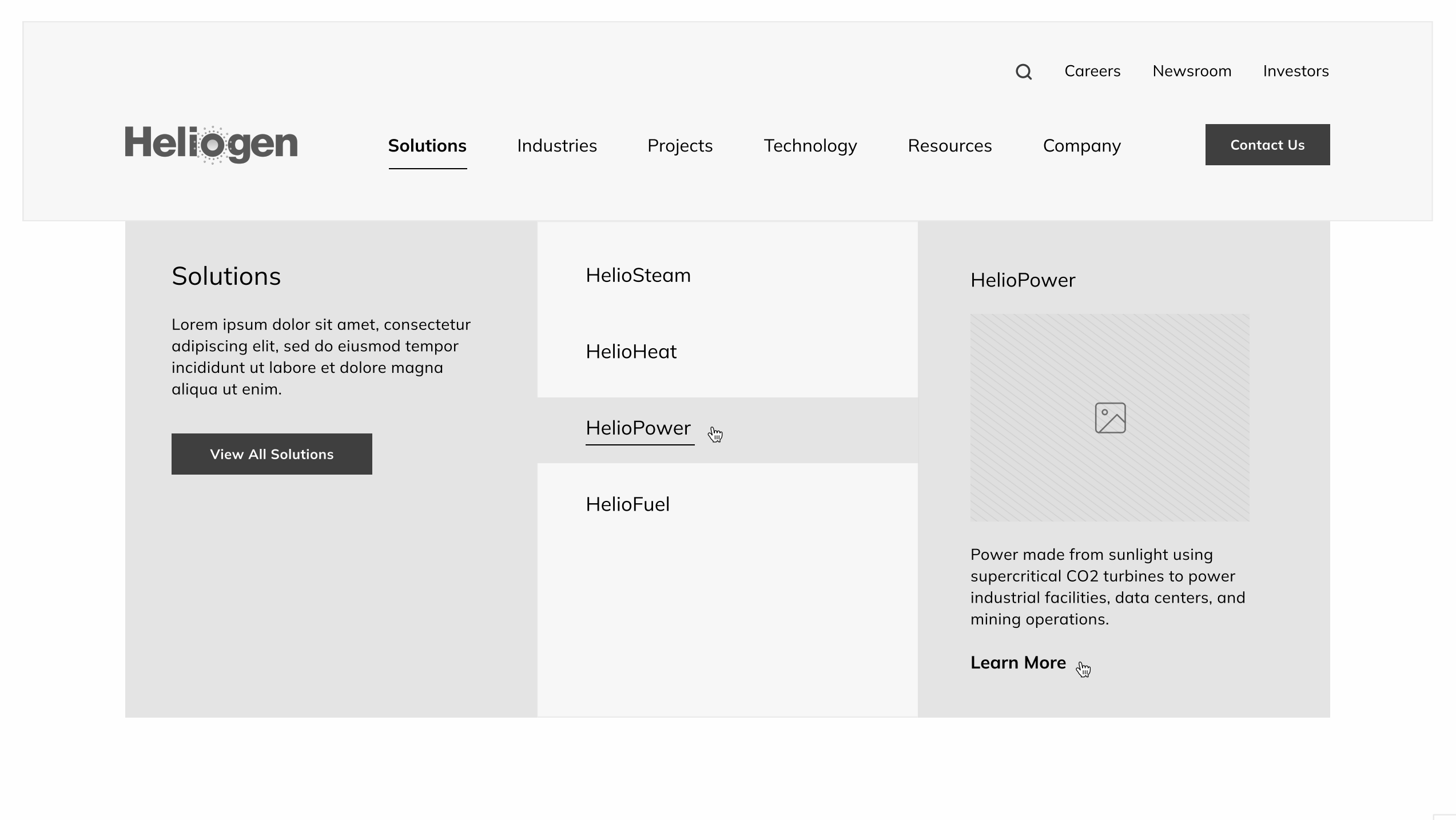 I created a megamenu to make the company appear more established. Since their solutions, projects, and technology would be specific to their company, I provided short descriptions to give users more context about the page before clicking on them.