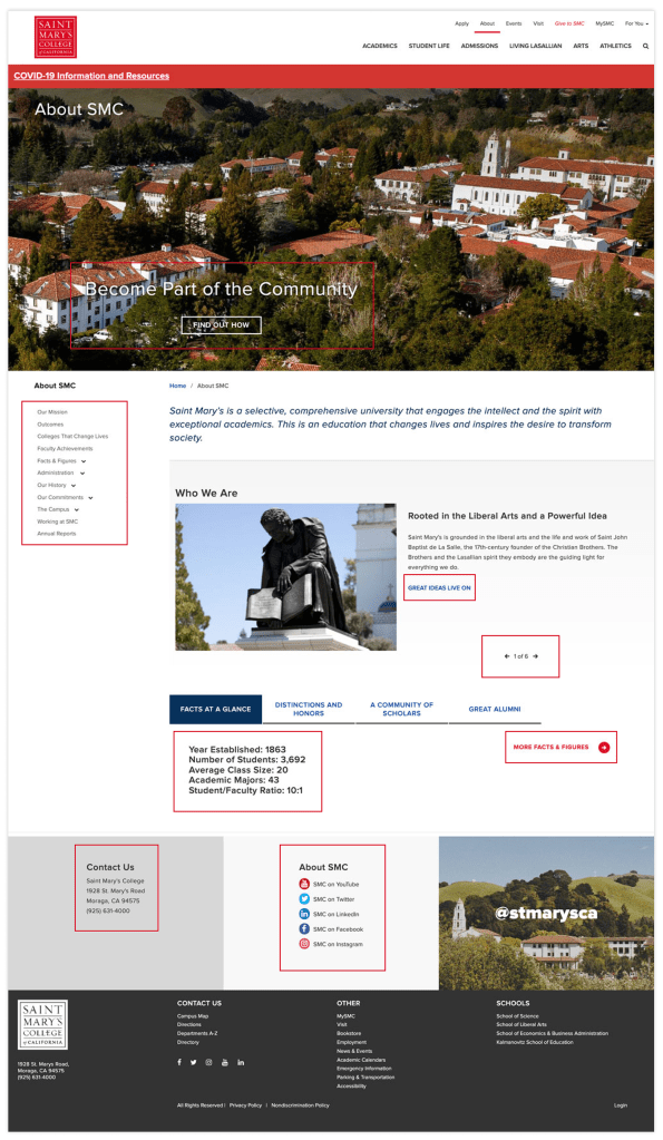 Saint Mary’s College of California is a small, private college that not a lot of people know of. Since Saint Mary’s basketball team made it to the NCAA Championship, we were getting a lot of traffic on our about page during the games. We found that people were curious as to who we are and wanted to learn more about us. My task was to redesign the about page in order to inform and attract prospective students.